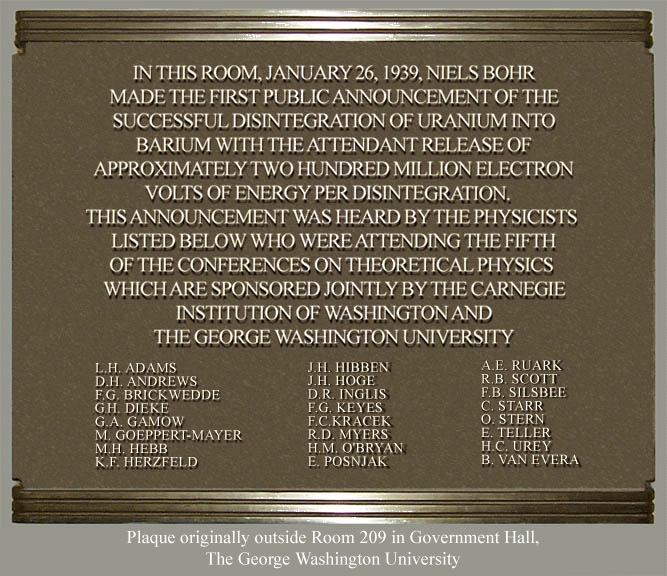 On January 26, 1939, Niels Bohr publicly announced the splitting of the uranium atom. A plaque outside the entrance to Corcoran Hall at The George Washington University commemorates this.